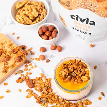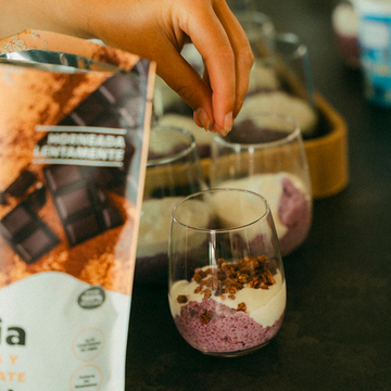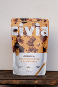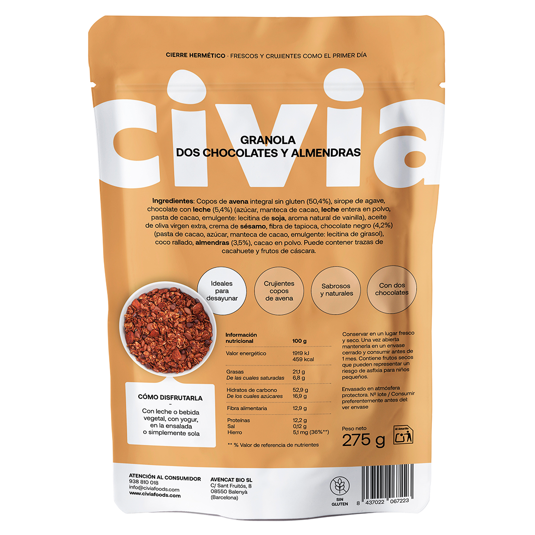 Delicios mezcla crujiente de copos de avena con cacao, almendras, chocolate negro y chocolate con leche. Es una excelente fuente de energía y de proteínas vegetales que ayudan a cuidarte.