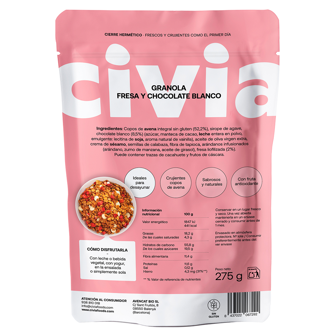 Deliciosa mezcla crujiente de copos de avena con fresa, chocolate blanco y semillas de calabaza. Es una excelente fuente de energía y de proteínas vegetales que ayudan a cuidarte.